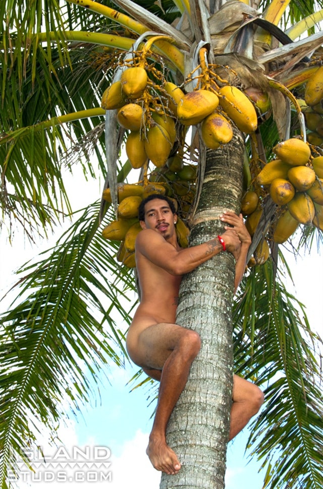 Island Studs says: If you have ever fantasied about watching a real native hawaiian boy climb a coconut tree naked to harvest coconuts for you, kulu is not to be missed. This sexy 25 year old local island boy with smooth golden-brown skin climbs trees with his huge 9 inch black cock and beautiful hairless bubble butt exposed for all to see.